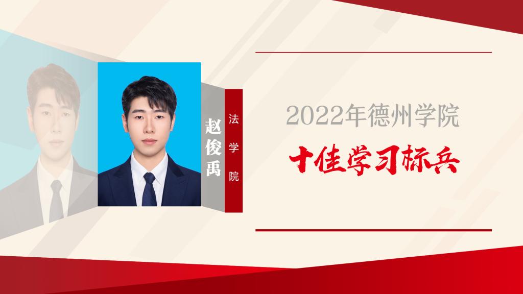 赵俊禹,中共预备党员,法学院2019级法学专业学生。“博观而约取,厚积而薄发”正是赵俊禹的真实写照。各学期学业成绩、综合测评成绩、平均绩点均排名专业第一(专业共101人),荣获国家奖学金、山东省政府奖学金以及德州学院优秀大学生奖学金、综合一等奖学金。通过大学英语四级(596分)、六级(561分),考取“会计专业技术资格证”“高中教师资格证”“国际人才英语证书”。获得“外研社国才杯”全国英语演讲大赛等多个省级奖项;疫情防控和德州创建全国文明城市期间积极参加志愿服务工作。“勤学善思,知行合一”,赵俊禹以实际行动肩负起新时代大学生的历史使命与责任担当,领跑青春赛道,冲刺当代青年最好成绩。