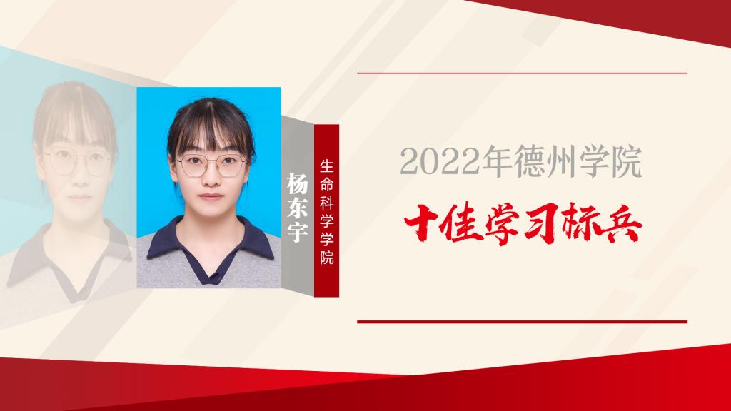 杨东宇,中共预备党员,生命科学学院2019级生物科学专业学生,班长。入学以来,杨东宇积极进取,成绩优异,学业成绩和综合测评成绩每学期均在班级前15%,荣获国家奖学金、德州学院“优秀大学生奖学金”“综合三等奖学金”“三好学生”等荣誉;积极参加科技竞赛活动,勇于创新,开拓进取,曾获得2021年全国大学生生命科学竞赛全国三等奖、2021年全国大学生生命科学竞赛山东省一等奖等奖项;身为学生干部,热情帮助同学,尽心辅佐老师,搭建好老师与学生之间的桥梁,得到老师同学的一致好评,荣获德州学院“优秀学生干部”称号。