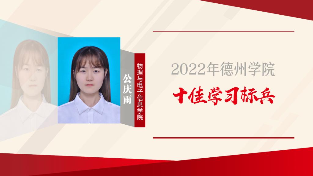 公庆雨,中共预备党员,物理与电子信息学院2019级物联网工程专业学生。自入学以来,刻苦学习,努力奋斗,一直将学习科学知识、锤炼奉献精神当做自己的初心使命。2019-2020学年学业成绩86.93,排名8/125,综合成绩88.44,排名5/125;2020-2021学年学业成绩86.38,排名7/125,综合成绩88.35,排名5/125,连续两年荣获德州学院综合一等奖学金、德州学院三好学生以及国家励志奖学金奖项,荣获省级优秀学生称号。此外,公庆雨积极参加各项活动和比赛,荣获全国大学生电子设计竞赛省级二等奖、山东省大学生物理竞赛省级一等奖、第14届中国大学生计算机设计大赛省级三等奖等奖项。