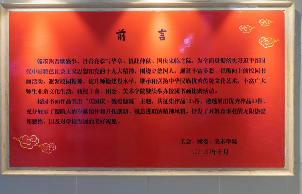 翰墨飘香歌盛事,丹青亮彩写华章。10月2日,“庆国庆﹒我爱德院”校园书画展开展仪式在美术公教楼前举行。