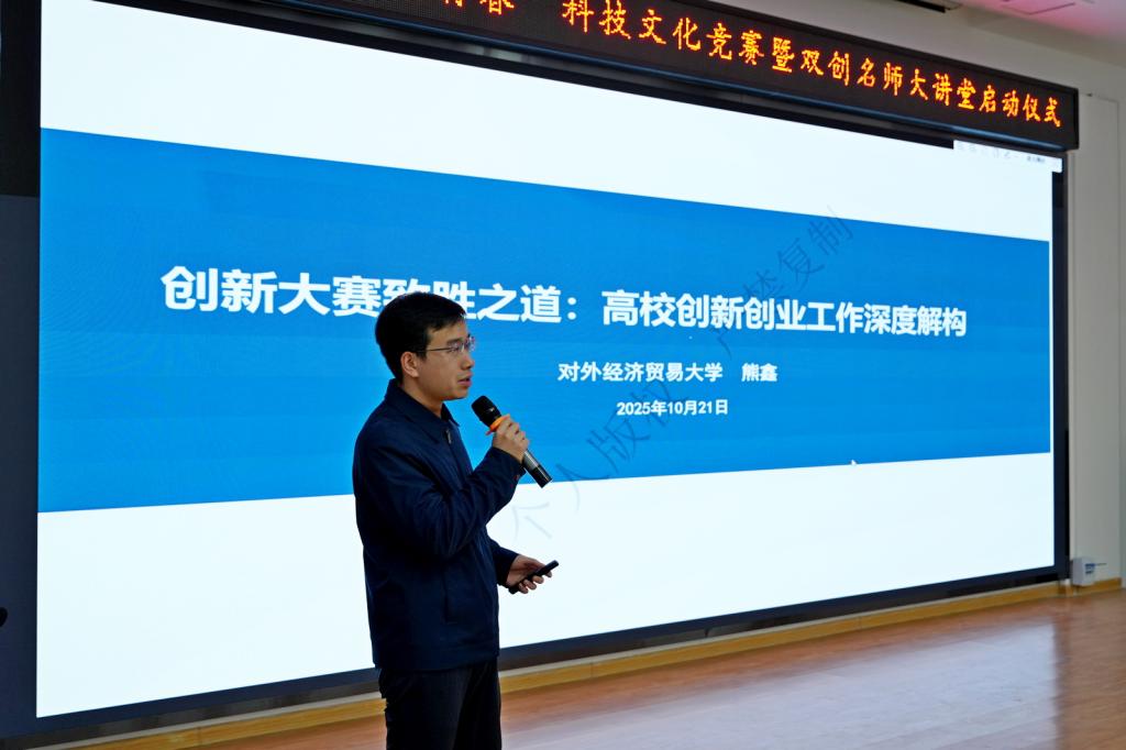 最后,对外经济贸易大学创新创业中心熊鑫主任为师生们作了“创新大赛致胜之道:高校创新创业工作深度解构”的主题报告,熊主任从双创赛事解析、创业项目破题、项目落地和可持续发展、商业BP的撰写等方面进行了精彩的讲解,从学校赛事组织角度系统介绍了创新创业人才培养为什么做、如何做以及如何通过赛事体现育人成效等问题。这些宝贵经验为我校创新创业人才培养提供了有益借鉴,并引发了现场师生的强烈共鸣和热烈讨论。