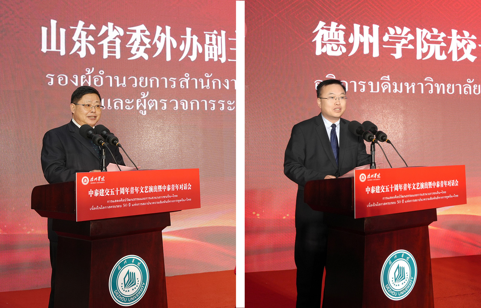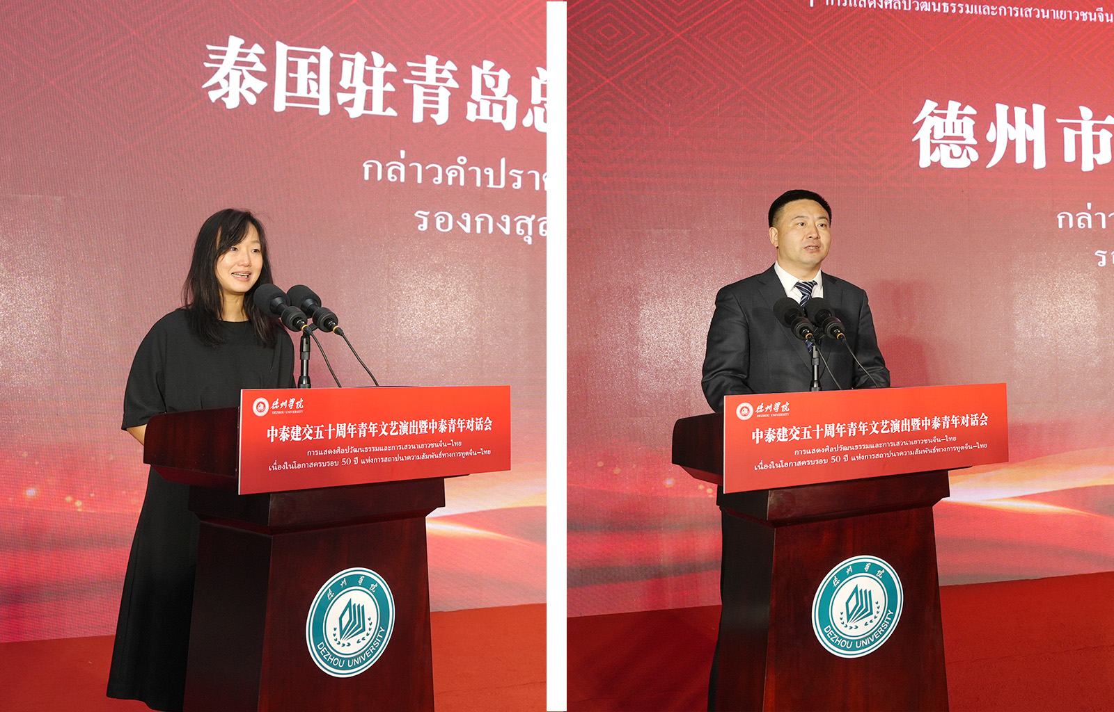 金清清在致辞中高度评价了中泰两国在各领域的合作成果,她期待通过此次活动,同学们在德州学院的泰国角尽情地、有趣地体验和享用这个空间,促进两国人民的交流,加深“中泰一家亲”的友好情谊。陈海明在致辞中指出,青年交流活动,正是为了赓续传统,让中泰友好的接力棒在一代又一代青年手中稳稳传递。他希望通过此次活动,进一步推动德州与泰国各地在多领域、各层次的交往,建立更紧密联系,共同为中泰友谊万古长青注入青春智慧与力量。
