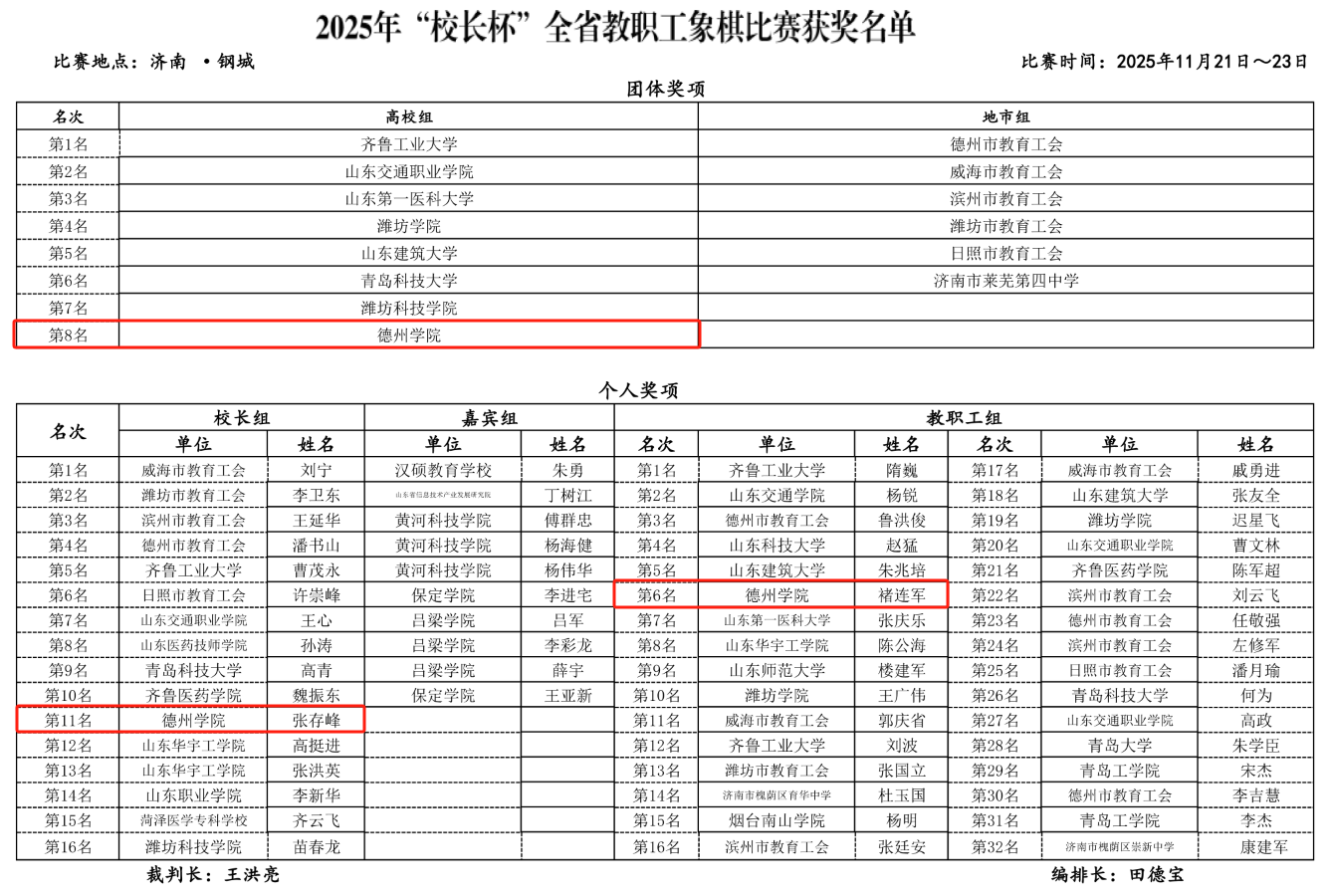 11月21日至23日,由山东省棋牌运动管理中心与山东省教育工会委员会联合主办的2025年“校长杯”全省教职工象棋比赛在济南市钢城区成功举办。活动旨在弘扬中华优秀传统文化,丰富教职工精神文化生活,促进高校与地方交流合作,同时推动象棋文化的传承与发展。学校积极响应,选派由校党委副书记张存峰及褚连军、牛永刚、赵兴堂三位象棋爱好者教师组成的代表队参赛。
