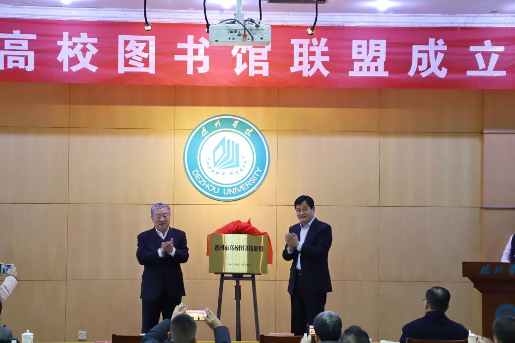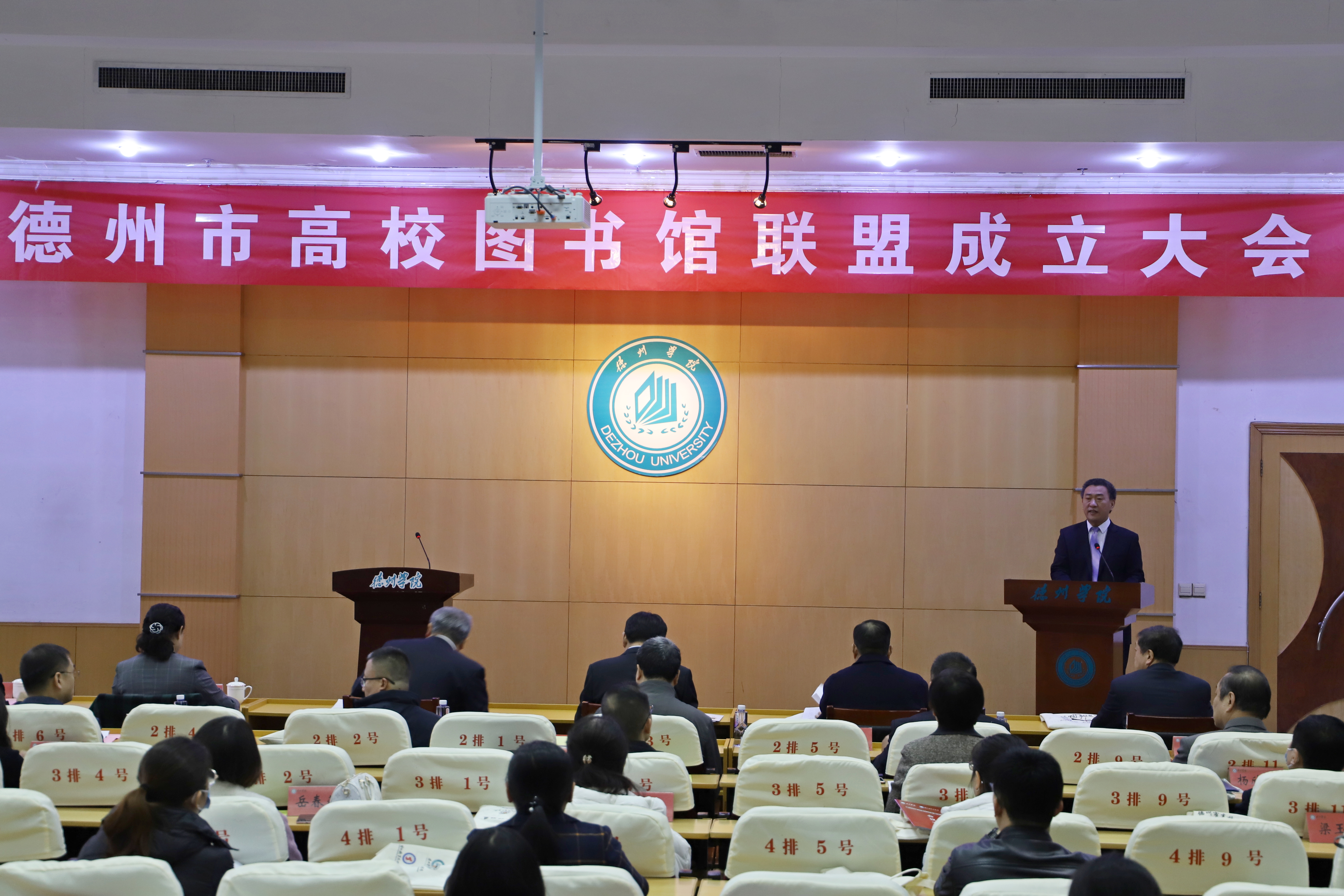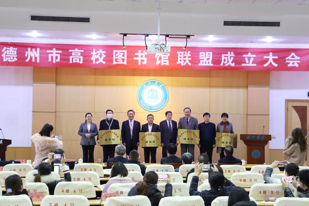 12月15日,由德州学院图书馆、山东华宇工学院图书馆、德州职业技术学院图书馆、德州科技职业学院图书馆组成的德州市高校图书馆联盟成立大会在德州学院厚德楼四楼报告厅举行。德州学院校长赵胜村、德州市政协副主席崔书强出席成立大会并共同为联盟揭牌。山东省高校图书情报工作委员会秘书长、山东大学图书馆馆长赵兴胜发来贺信。会议由德州学院副校长张明征主持并致欢迎辞。中国知网山东分公司总经理许贵宾出席会议并致贺词。出席会议的还有联盟院校副校长刘润华、张苹和王来恩。德州市政协秘书处和文史委负责人以及部分师生代表参加了大会。