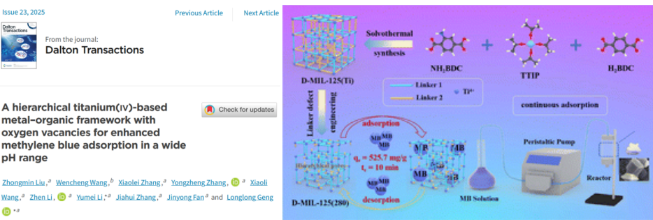 亚甲基蓝(Methylene blue,MB)广泛应用于印染和纺织工业领域,然而MB生物可降解性差,人体接触水体中高浓度MB可产生头痛、恶心等不良反应。因此,研究和开发高效脱除印染废水MB的吸附剂具有重要意义和实际应用价值。金属-有机框架(MOF)材料凭借其结构的可调节性,在先进功能材料的开发中备受关注,研究团队结合已有经验提出了一种构建具有多级孔和氧空位协同作用的Ti-MOF吸附剂的策略,该吸附剂实现了水体中MB的快速高效连续去除,其吸附速率和去除效率在同类材料中达到国际领先水平。这一创新策略为染料吸附材料的设计提供了有效的借鉴,有望在环境治理方面发挥重要作用。该工作得到国家自然科学基金、山东省自然科学基金、山东省青创科技计划、德州学院青创科技计划等经费资助。