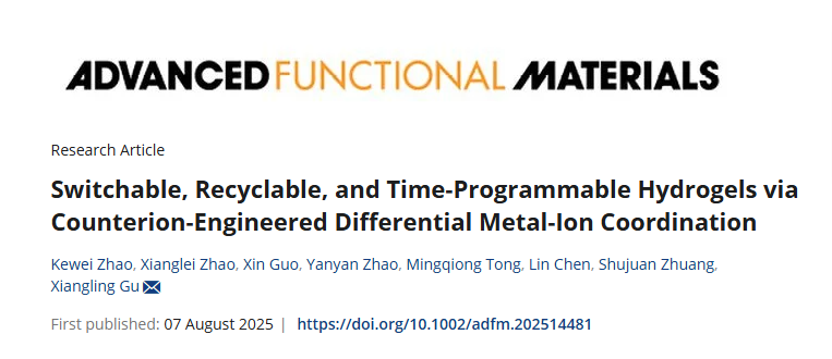 近日,我校与山东理工大学联合培养硕士研究生赵可伟(导师:顾相伶教授),作为第一作者,以德州学院为第一完成单位在材料类Top期刊《Advanced Functional Materials》发表最新研究成果:基于抗衡离子调控策略开发出集功能切换、绿色回收与动态加密于一体的多功能水凝胶。