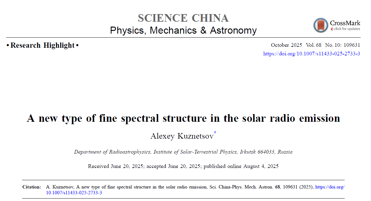 针对此工作,俄罗斯科学院西伯利亚分院日地物理研究所太阳射电天体物理研究室主任Alexey Kuznetsov教授发表题为《A new type of fine spectral structure in the solar radio emission》的评述文章(Alexey Kuznetsov 2025, Sci. China-Phys. Mech. Astron. 68, 109631)。Kuznetsov教授高度评价了该研究的创新性,指出这种此前未被发现的周期性珠状条链结构为理解太阳射电暴的辐射机制提供了新线索,所提出的“等离子体双共振+磁流体波调制”模型合理解释了观测结果,具有重要的理论和诊断意义。