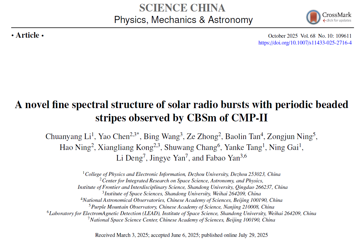 近日,物理与电子信息学院教师李传洋博士在天体物理领域top期刊《Science China-Physics, Mechanics & Astronomy》(中科院一区,IF=7.5)上发表题为《A novel fine spectral structure of solar radio bursts with periodic beaded stripes observed by CBSm of CMP-II》的科研论文(Li et al. 2025, Sci. China-Phys. Mech. Astron. 68, 109611)。德州学院为第一完成单位,我校盖宁教授为共同作者。