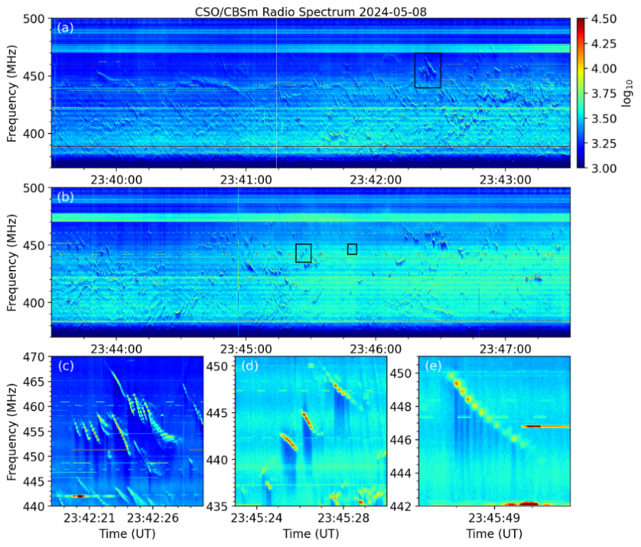 图1.(a)与(b)展示了包含丰富精细结构的CBSm动态频谱图,(c)-(e)为黑框区域的放大图。