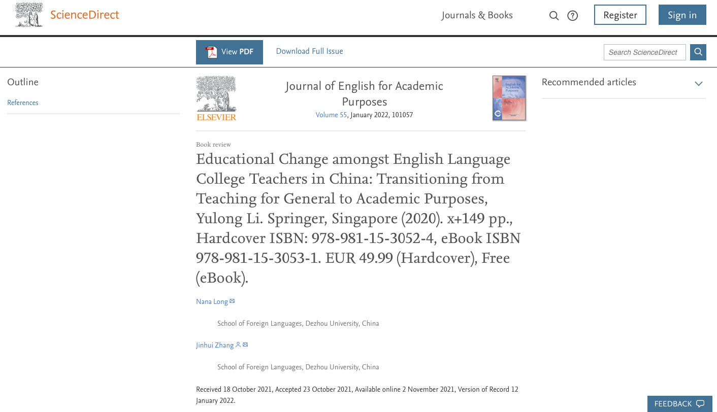 近期,外国语学院龙娜娜博士在《Journal of English for Academic Purposes》发表了题目为“Educational Change amongst English Language College Teachers in China: Transitioning from Teaching for General to Academic Purposes”的文章。《Journal of English for Academic Purposes》是由英国学术英语教师协会(BALEAP)创办、Elsevier集团出版的语言学领域期刊。该刊在2022年最新版SSCI语言学期刊目录中位于二区,近五年平均影响因子为3.229。