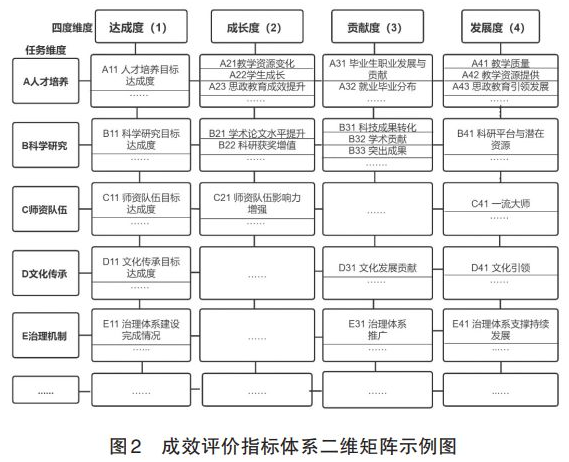 1.二维结构体系模型构建的基本方法。前面分析的成效评价的基本内涵是体系构建的基本依据,具体的评价体系基于政策依据和理论依据对评价目标的分解,通过立体的统筹分析,在满足可评性的基础上,设计结果简化为“二维结构体系模型”。第一维度为:建设任务要素,表达基本成果;第二维度为建设任务完成与发展效果要素,也可称为四度要素,表达主要效果、效益和效能。由于二维内容交错,所以呈现为矩阵式指标体系框架。(见图2)根据三维立体设计理念,研究如何形成独特的体系结构和内涵,既具有可评性,又包含了四度导向的思想,使得二维评价体系内涵更贴近成效评价目标。二维结构体系模型是本研究提出的成效评价突出的特征,其中每个指标都可能包含两个维度的含义,但两个含义可能不是平均分布,分布的情况与指标选定有关。该模型拟研究的内容,下面以“人才培养”一级指标为例,建立其内涵时(二级指标或观测点)兼顾四度理念,进行科学分级,如“思政教育特色与成效”“教学资源提供”“教学质量”“学生学习成果”“学生成长”“就业分布”“毕业生职业发展与社会贡献”等。需要说明的是,每个二级指标不一定都具有同等程度的四度特性,如“学生成长”指标其成长度特征明显,其他的特征较弱。