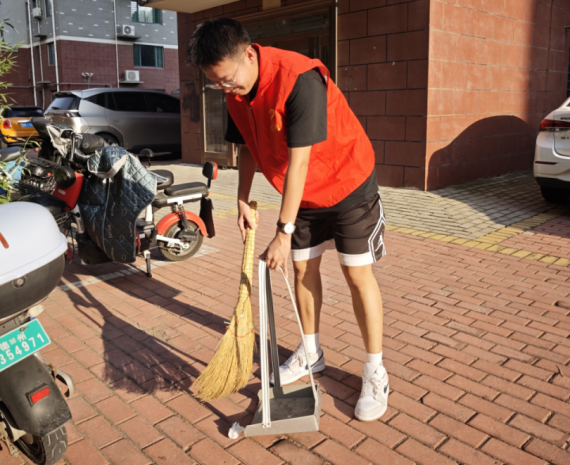 在志愿服务活动中,我与其他学生党员一同,身着醒目的体育学院志愿者红马甲,穿梭于家乡的社区里。清理环境卫生是我们的重点任务之一。从街道的这头到那头,不放过任何一个角落。遇到一些被风吹到角落或者卡在砖缝里的细小垃圾,扫帚难以清理,我们就直接用手去捡拾,放入对应的垃圾桶内。