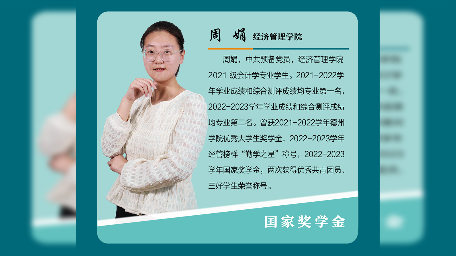 周娟,中共预备党员,经济管理学院 2021 级会计学专业学生。2021-2022学年学业成绩和综合测评成绩均专业第一名,2022-2023学年学业成绩和综合测评成绩均专业第二名。曾获2021-2022学年德州学院优秀大学生奖学金,2022-2023学年经管榜样“勤学之星”称号,2022-2023学年国家奖学金,两次获得优秀共青团员、三好学生荣誉称号。思想坚定,紧跟党走青年不惧岁月长,彼方尚有荣光在。作为一名中共预备党员,周娟始终坚守初心,不忘使...