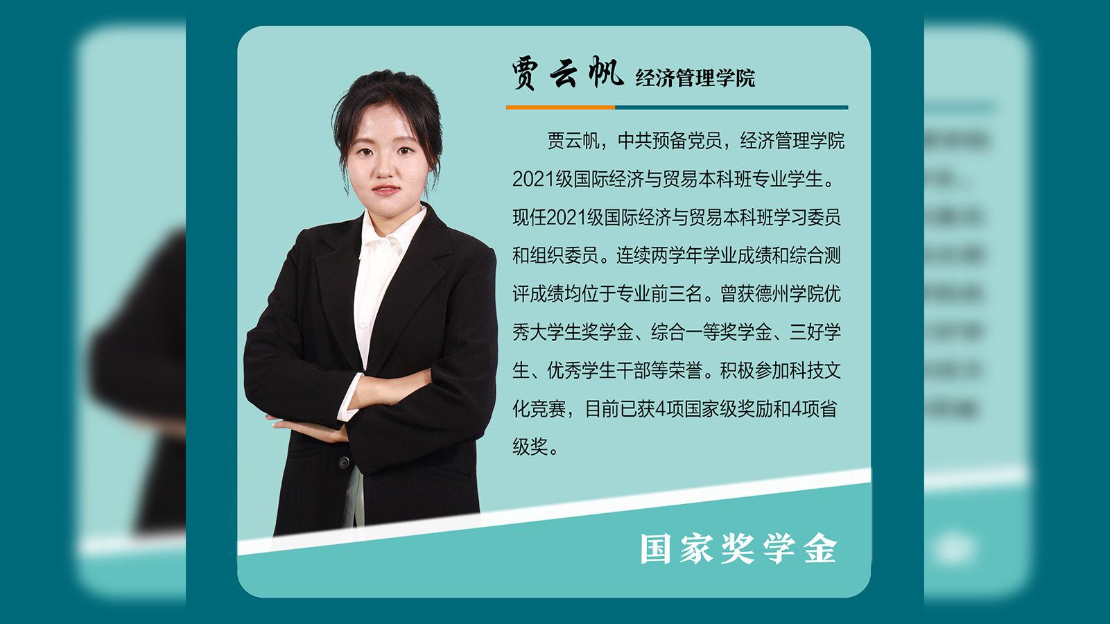贾云帆,中共预备党员,经济管理学院2021级国际经济与贸易本科班专业学生。现任2021级国际经济与贸易本科班学习委员和组织委员。连续两学年学业成绩和综合测评成绩均位于专业前三名。曾获德州学院优秀大学生奖学金、综合一等奖学金、三好学生、优秀学生干部等荣誉。积极参加科技文化竞赛,目前已获4项国家级奖励和4项省级奖。思想进步,与时俱进贾云帆入学以来,不断坚定信仰,砥砺前行。在思想上,她热爱祖国,热爱人民,思...