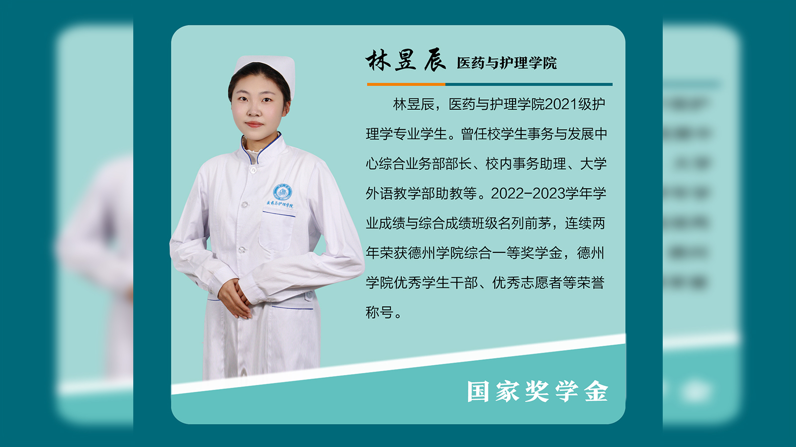 林昱辰,医药与护理学院2021级护理学专业学生。曾任校学生事务与发展中心综合业务部部长、校内事务助理、大学外语教学部助教等。2022-2023学年学业成绩与综合成绩班级名列前茅,连续两年荣获德州学院综合一等奖学金,德州学院优秀学生干部、优秀志愿者等荣誉称号。气有浩然,学无止境入学以来,林昱辰一直把学习当做第一要务,有着明确的学习目标和端正的学习态度。作为学生干部,她更加严格的要求自己,刻苦学习,认真钻研,...