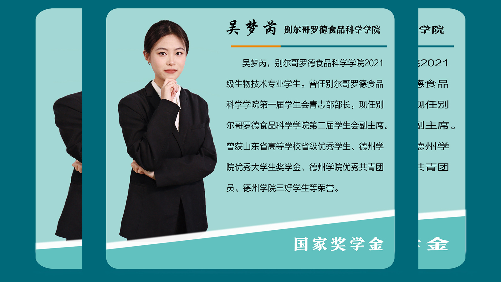 吴梦芮,别尔哥罗德食品科学学院2021级生物技术专业学生。曾任别尔哥罗德食品科学学院第一届学生会青志部部长,现任别尔哥罗德食品科学学院第二届学生会副主席。曾获山东省高等学校省级优秀学生、德州学院优秀大学生奖学金、德州学院优秀共青团员、德州学院三好学生等荣誉。刻苦学习,致知力行从步入校园那一刻起,吴梦芮便下定决心,做好每学年的阶段性规划。在专业知识学习方面,坚持在保持长板的基础上正视短板并有针对性...